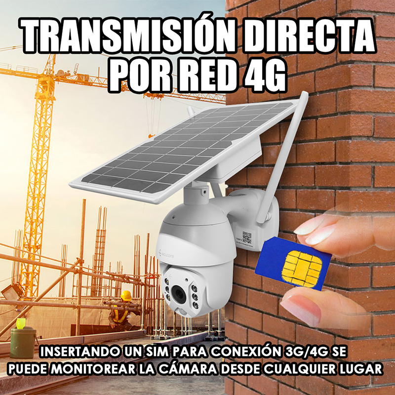 Lente 3.8 mm - Angulo de visión 75° - Audio bidireccional (microfono y bocina) - Sensor PIR (deteccion hasta 10 mts) - 6 Baterias recargables de 3200 mAh - Para exterior - IP66 - Ranura micro SD (soporta hasta 128 GB) - Ranura SIM para conexión 3G o 4G - Compresion H.265 - 4 LEDs IR (vision nocturna hasta 10 mts), 2 LEDs blancos - Panel solar de 8W.