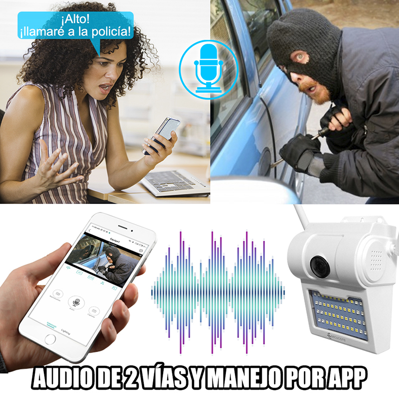 Lente 1.4 mm - Angulo visión 160 grados - Para interior o exterior - Lampara con 32 LEDs blancos - Sensor PIR integrado - Compresion H.265 - Grabacion en nube - Audio bidireccional - Encendido/apagado desde app - Ranura micro SD (soporta hasta 128 GB)